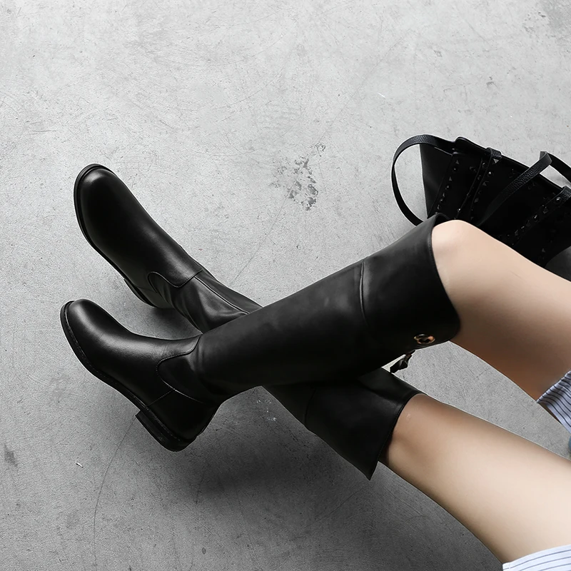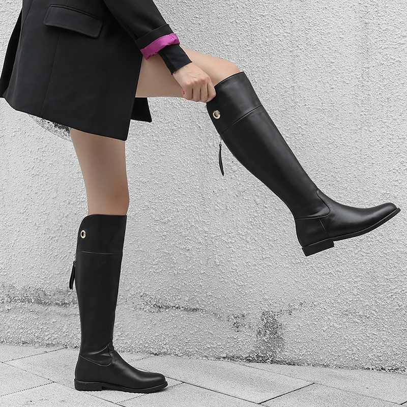WETKISS Cow Leather Women Knee High Boots Motorcycle Round Toe Zip Footwear Low Heels Female Riding
