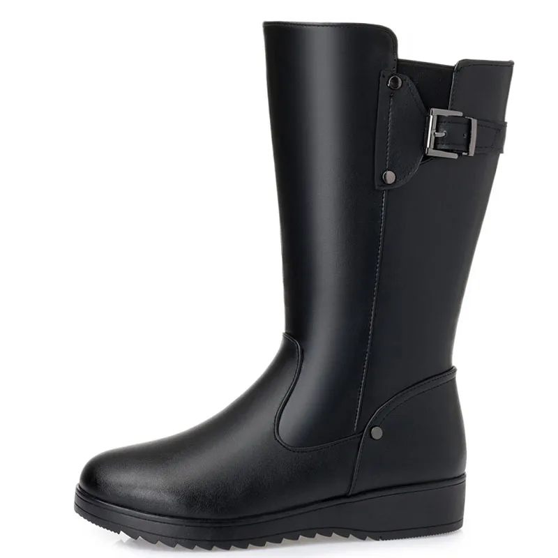 Hot Sale DRKANOL Natural Wool Fur Warm Snow Boots Women Winter Flats Mid Calf Boots Genuine Leather Waterpro