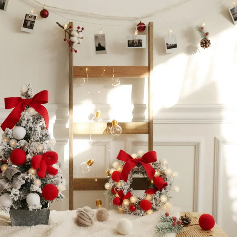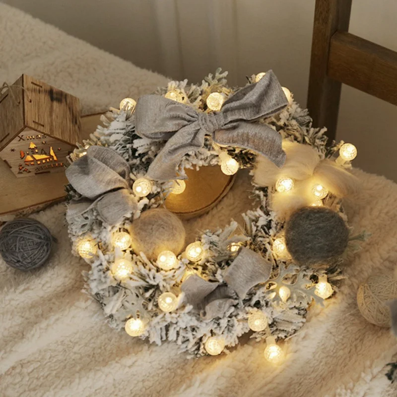 Hot New Christmas Wreath With LED String Light Bowknot Plush Balls Decorated Garland For Front Door